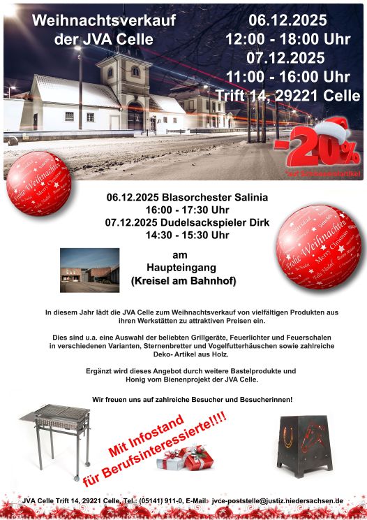 In diesem Jahr lädt die JVA Celle zum Weihnachtsverkauf von vielfältigen Produkten aus ihren Werkstätten zu attraktiven Preisen ein.